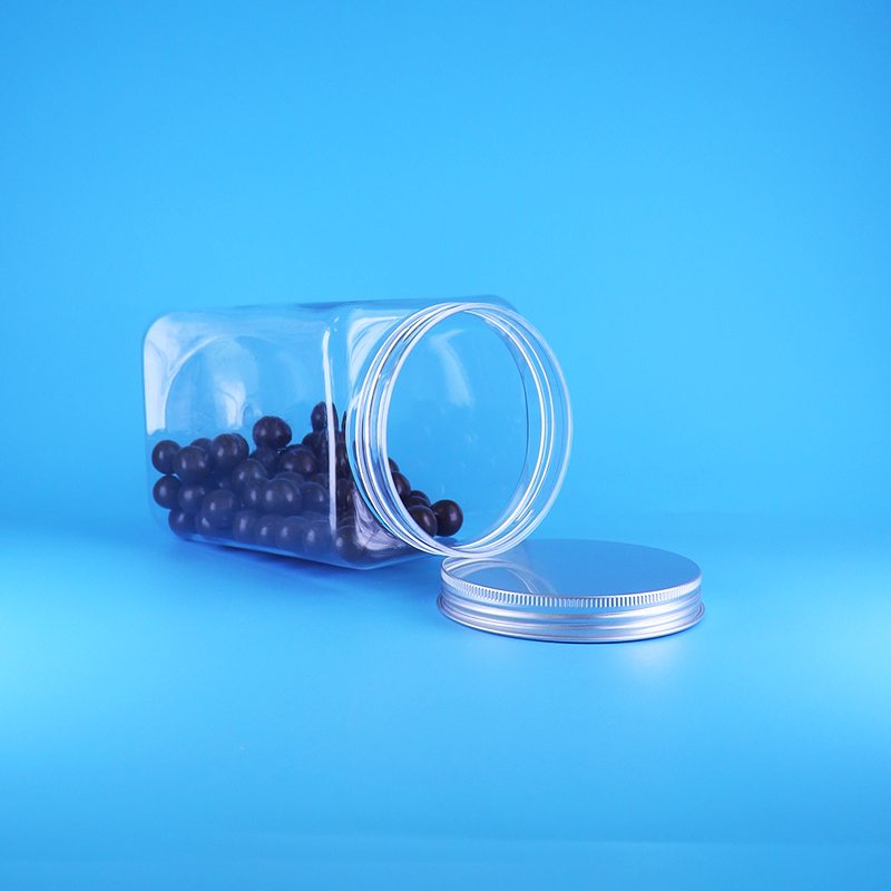 Transparante Goedkope Lege Vierkante PET Plastic Snoep Hoge Potten Bulk Platte Aluminium Dop